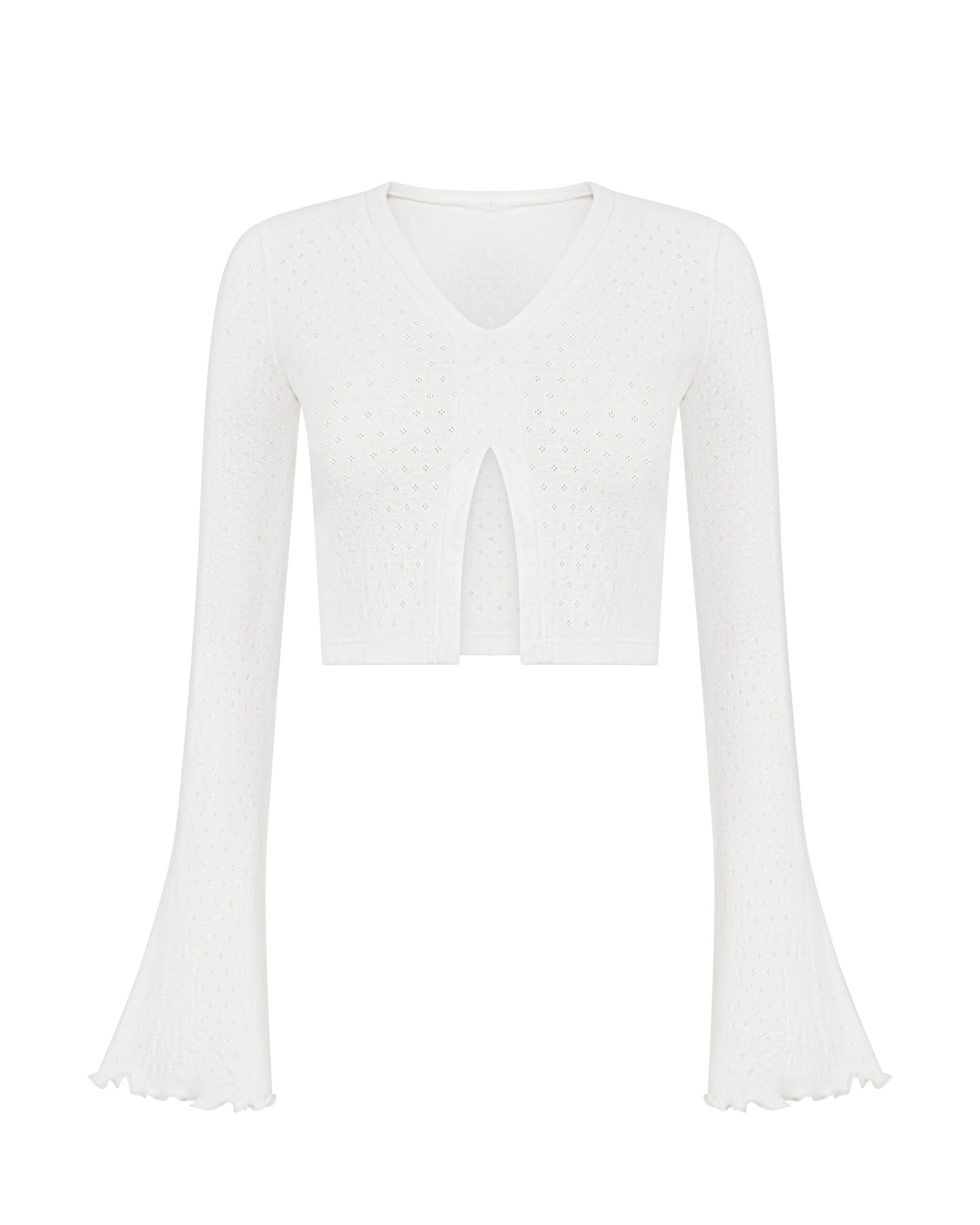 Ніжний кроп-топ, виконаний з легкої та приємної на дотик тканини. Модель має глибокий V-подібний виріз та розріз спереду, що додає образу жіночності та оригінальності. Довгі рукави з делікатною хвилястою обробкою створюють витончений силует. Ідеально підходить як для повсякденного образу, так і для створення модного домашнього луку.
